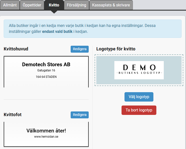Gällande knappen "Välj logotyp" så kan man inte lägga in egna bilder utan detta görs på annat sätt i kassan. Finns det flera logotyper att tillgå kan man här välja vilken man ska använda.