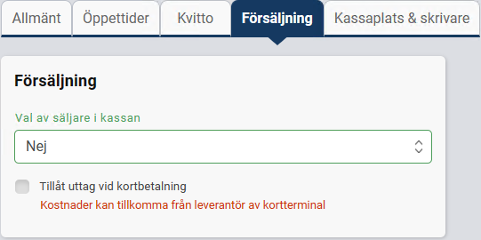 Val av säljare i kassan har tre alternativ som gäller för försäljningsfönstret.