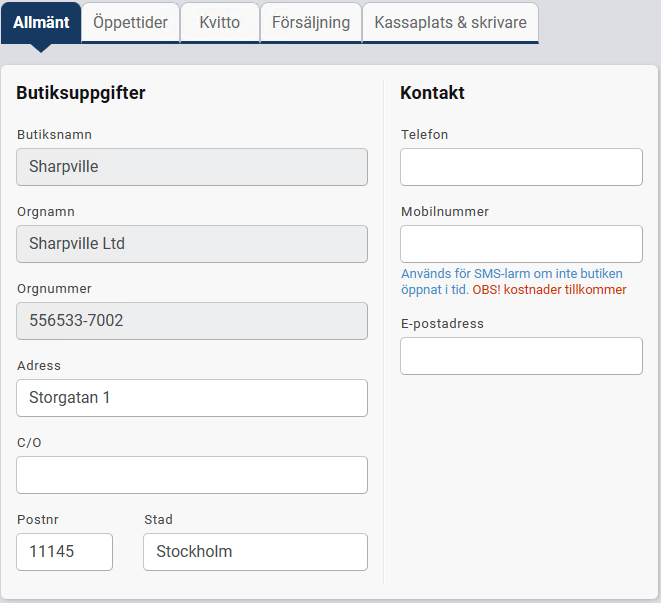 Vissa fält går inte att ändra och dessa är gråmarkerade. Det är Butiksnamn, Orgnamn samt Orgnummer.