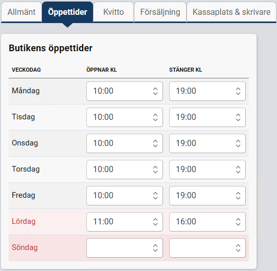 I butiksinställningarna lägger man in kontaktuppgifter, öppettider, konfigurerar kvittoinställningar samt ställer in kvittoskrivare och kassalåda.