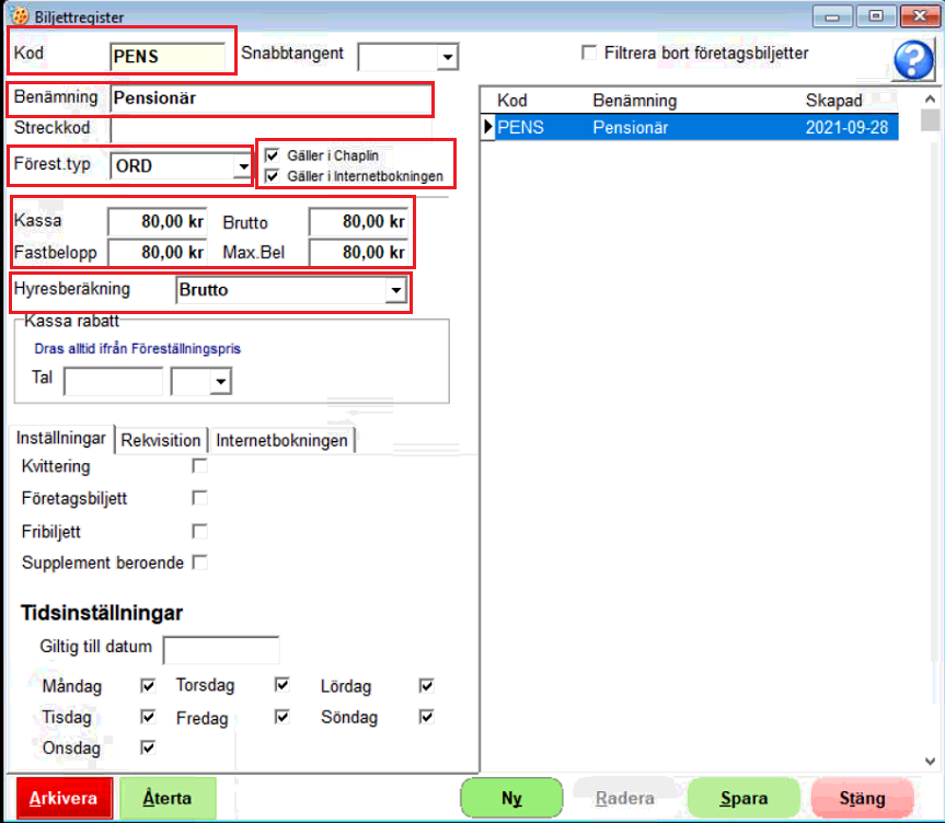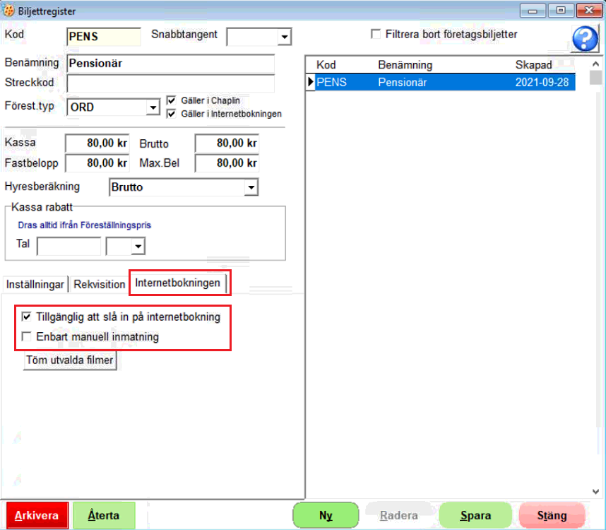 - Välj vart denna biljettkod ska kunna användas, Chaplin och/eller Internetbokningen