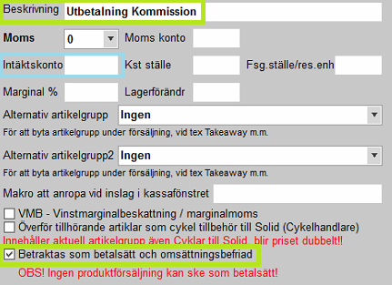 Ange i rullistan under valen för Kommissionsbetalsätt det betalsätt som ska belastas vid utbetalning av kommission. Välj det betalsättet som skapades ovan.