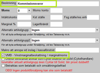 Varorna för kommissionsförsäljning bör registreras i en eller ett par separata artikelgrupp avsedd enbart för kommissionsartiklar. Skapa en artikelgrupp med VMB (vinstmarginalbeskattning när beskattningen enbart ska räknas på vinsten). Detta är samma förfarande om man säljer begagnade varor som inte är en kommissionsvara.