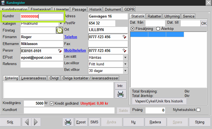Registrera kunduppgifter för kommittenten i kassans kundregister via menyn Register - Kundregister - Kundregister eller [CTRL+K]. Tryck på knappen [Ny Kund] och ange fullständiga uppgifter samt spara. Notera / kopiera kundnumret.