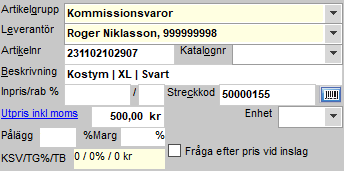 Öppna artikelregistret via Register - Varuförsäljning - Artiklar och registrera artikeln på samma sätt som andra artiklar registreras. Välj att placera den under varugruppen för de separata kommissionsartiklarna och ange kommittenten som leverantör av vapnet. Tänk på att varugruppen för kommissionsartiklar är markerad för att beräkna beskattning efter vinstmarginal som beräknas utefter skillnaden mellan inpris och utpris. Skillnaden mellan inpris och utpris är således den summa som är kvar efter att utbetalningen till kommittenten är gjord. Om detta är överenskommit går det bra att ange inpris (beloppet kommittenten ska få utbetalt) redan nu. I annat fall lämnas inpris blankt. Tänk också på att när inpriset är angivet räknas dessa in i beräkningen för lagervärde.