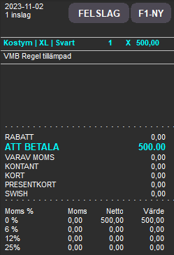 För att eventuella konteringsunderlag ska innehålla beräkningen för VMB behöver "inpris" (utbetalningsbeloppet) anges på varan innan rapporterna för detta tas ut.