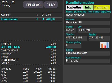 Sök fram kommittenten i sökfönstret och öppna kommissionsfönstret genom att klicka på kunduppgifterna eller trycka på knappen [OK].
