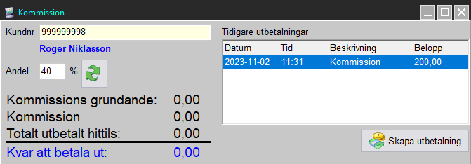 Öppna menyn Register - Kundregister - Kommission för att beräkna och skapa en utbetalning till kommittenten.