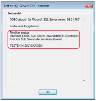 TESTEN MISSLYCKADES! visas. Felet som uppstår är för att odbcad inte kan logga in med användare ”sa” och är helt normalt. Databasen har hittats.