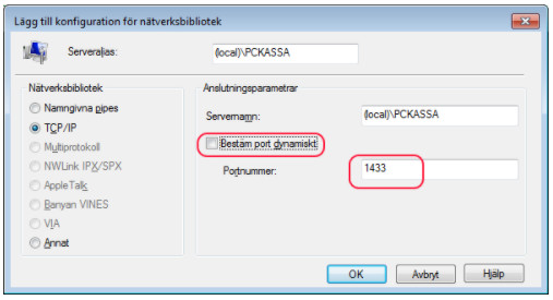 ”Bestäm port dynamiskt” ska Inte vara markerad. Portnummer ska vara 1433.