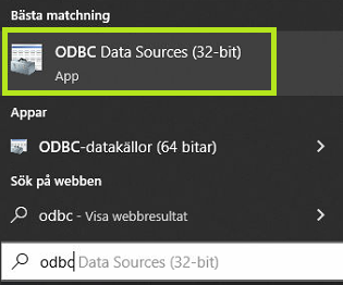eller genom att öppna Windows startmeny och skriva bokstäverna "odbc". Öppna "ODBC Data Sources (32-bit)".