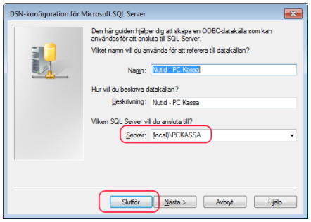 Kontrollera i klientens DSN-konfiguration för Microsoft SQL Server (odbcad32.exe), andra fliken, System-DSN, och dubbelklicka på Nutid - PC Kassa, att rätt IPnummer/datornamn är valt samt rätt databas (kan skilja sig enligt bilden om t.ex. instanser används).