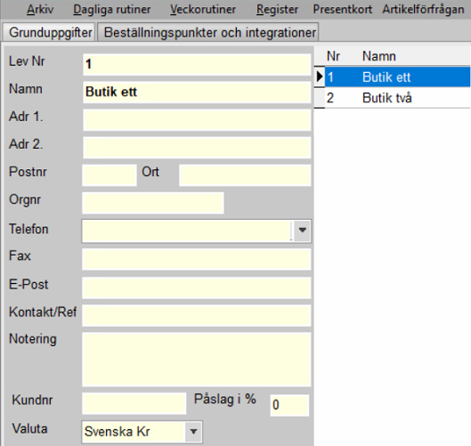Butikerna behöver även läggas upp och det gör man via menyn: Artikelförfrågan/Butiksregister