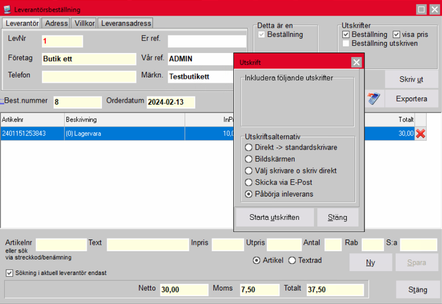 Nu kan man leverera in precis som vid en vanlig leverantörsbeställning och lagersaldot i Butik två justeras enligt inlevererat antal.