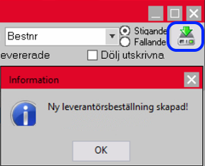 Tryck på knappen för att hämta leverantörsbeställning (inringat BLÅ i bilden)