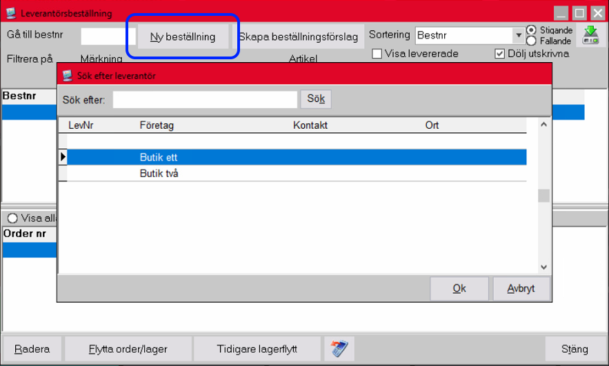 I Butik ett, gå till leverantörsbeställning (Leverantör/Beställningar) och tryck på knappen Ny beställning.