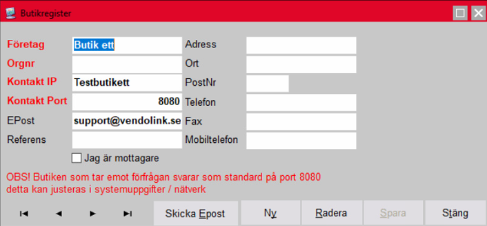 Här behöver man göra likadant i varje butik. Registret ska innehålla alla berörda butiker i respektive kassa. Det är även känsligt för stora och små bokstäver så skriver man "Butik ett" i fältet Företag så måste det stå likadant överallt. Samma gäller för fältet Kontakt IP. Kontakt IP ska alltså inte här ha en IP-adress (det är för en annan funktion och används inte här).