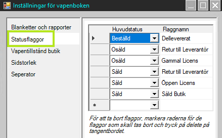 Det går bra att lägga till egna statusflaggor (flaggnamn) för enklare uppföljning och tydligare märkning. Statusflaggorna går sedan att välja genom att öppna upp ett vapen och markera detta för relevant status vartefter sökningar och urval kan göras på dessa.