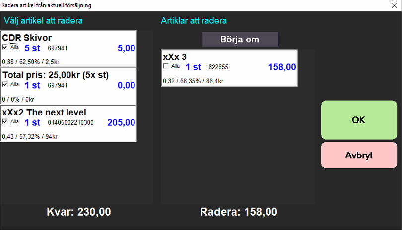 När man trycker på felslagsknappen kommer en ny ruta att visas (se bild nedan) med alla inslagna artiklar till vänster. Klicka på den artikel som ska tas bort från kvittot. Den kommer nu att landa på den högra sidan av skärmen. Den högra sidan av skärmen visar de artiklar som ska tas bort.