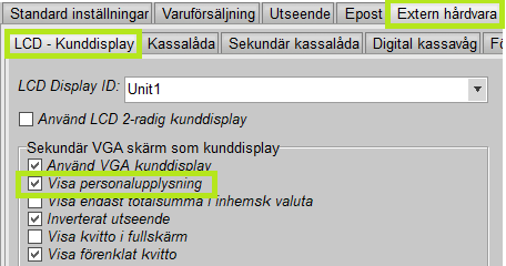 Öppna menyn Arkiv - Inställningar - Systemuppgifter och gå till fliken "Extern Hårdvara" samt vidare till "LCD - Kunddisplay". Markera därefter rutan "Visa personalupplysning" och spara samt starta om kassaprogrammet.
