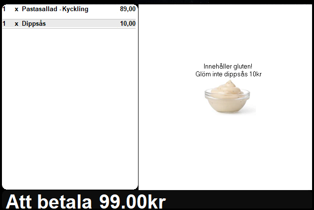 I exemplet är, utöver informationsmeddelandet, artikeln "Dippsås 10kr" kopplad till upplysningen på artikeln "Pastasallad - Kyckling" och även en bild för att det ska bli ännu tydligare vad budskapet avser.