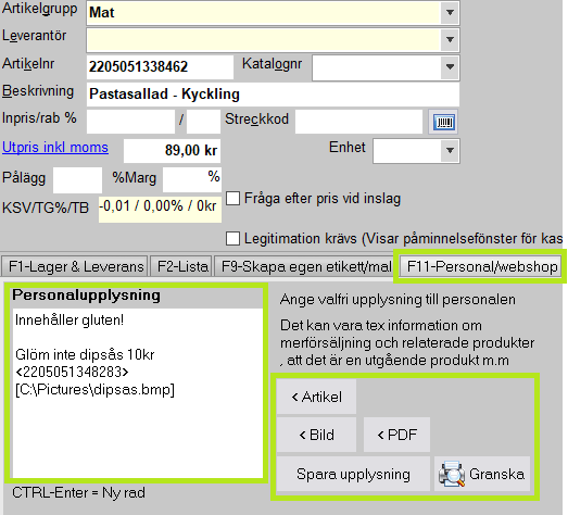 Det finns olika sätt att hantera automatiserad och viktig information till personalen som berör specifika inslag. I detta avsnitt beskrivs funktionen "Personalupplysning" för eventuell viktig information relaterad till pågående artikelinslag men som även kan användas till merförsäljning. Denna funktion kan också hantera bilder samt ställas in för att automatiskt visas på eventuell kunddisplay för ytterligare möjlighet till enkel merförsäljning.