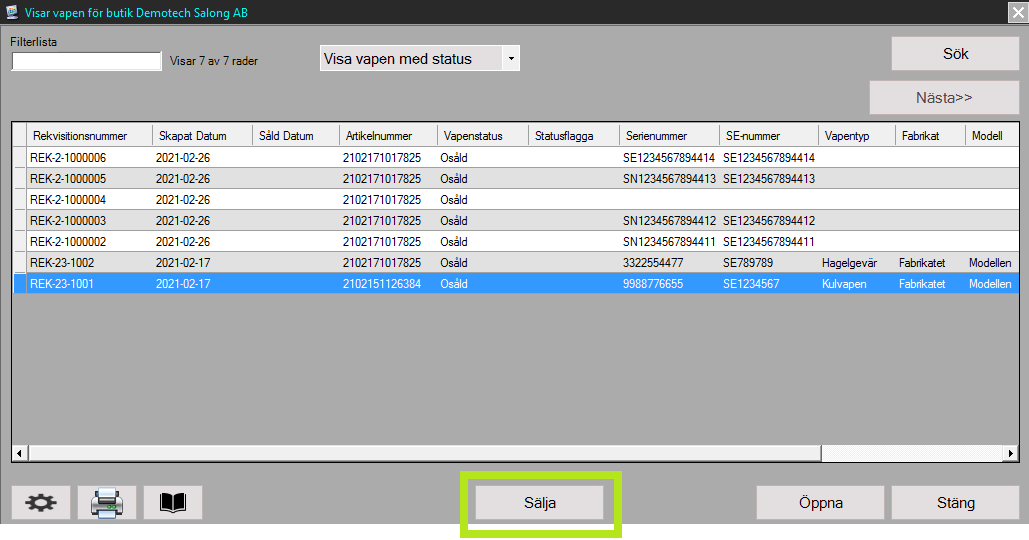 Tänk på att välja att även visa reserverade vapen i rullistan "Visa vapen med status" då detta inte längre har status "Osålt".