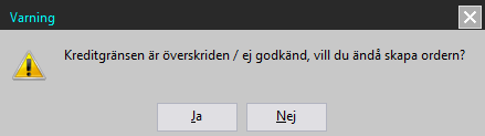Då vi inte aktivt angivit en kreditgräns på kunden och då detta enbart avser en reservation svarar vi "Ja" för att skapa ordern trots detta meddelande.