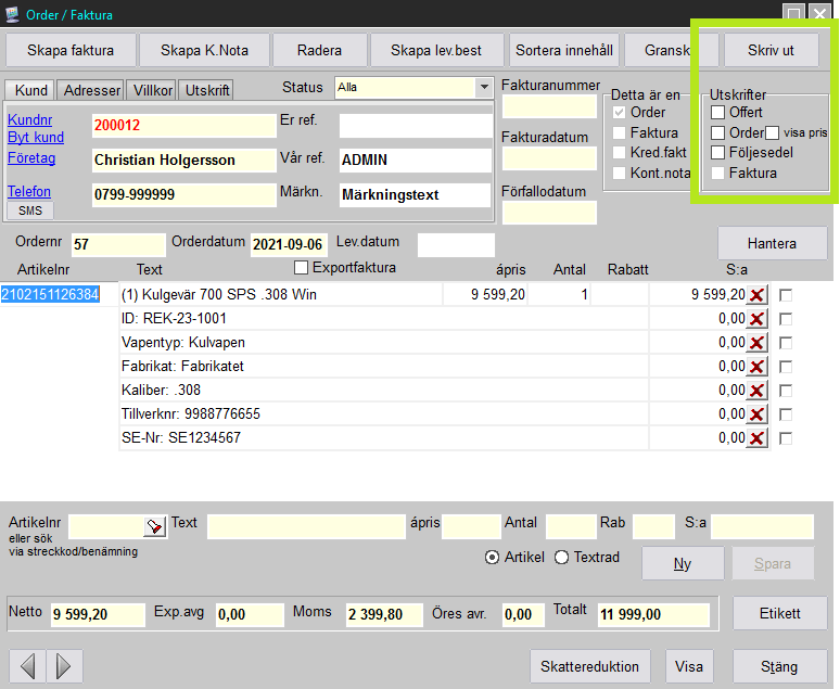 Det finns olika sätt att arbeta med orderläggning i kassaprogrammet. I detta avsnitt går vi igenom funktionen som sparar de pågående kvittoinslagen till en order. Detta innebär att man först hämtar upp vapnet från vapenboken till kvittofönstret precis som vid en vanlig försäljning men där man sedan istället använder en ny knapp för att spara kvittoinslagen till en order.