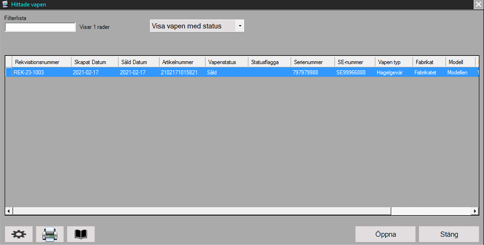 Tänk på att knappen "Skriv ut" tar fram underlaget från "gamla vapenboken" (enhetsbaserad artikel med unik data) och inte kan användas för sökning i nya vapenboken.