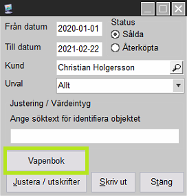 Ange datumintervall för sökningen och tryck på knappen [Vapenbok].