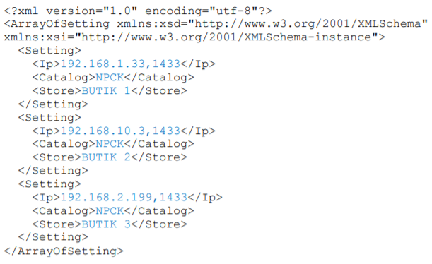 Vid installationen kopierades hela ”artfraga” mappen och lägg på kundens C:\ disk. I denna mappen finns en Settings.xml fil, öppna dem med Notepad och ange butikernas IP adresser samt SQL server port. Exempel:
