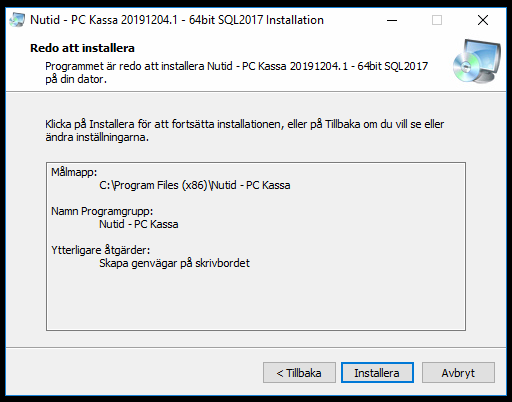 Installationen av PC-Kassa Demo med SQL och databas är klar och slutligen genomförs relevant uppdatering.