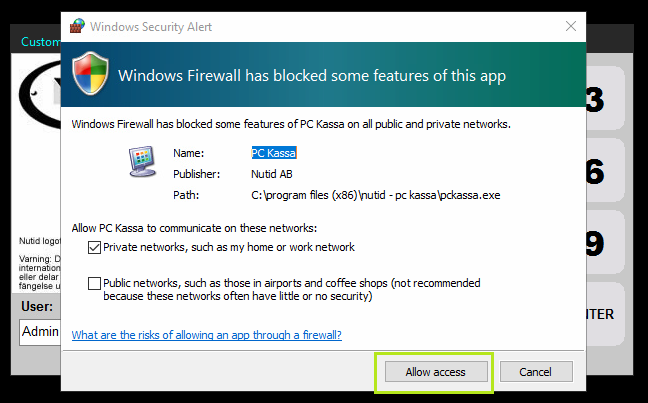 Om frågan att godkänna PC-Kassa i Windows brandvägg uppkommer behöver denna godkännas (Allow access).