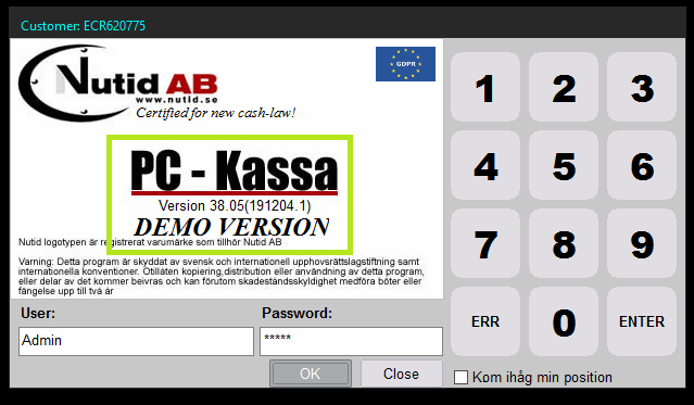 Detta installationspaketet innehåller databas och licens för demosyfte och versionen av PC-Kassa är 38,05 (Icke Fiskal / Utan Kontrollbox). Vanligtvis är nästa steg att antingen läsa in en databaskopia (om det rör sig om huvudkassabyte) eller vid helt ny kund ange kundens licensuppgifter samt uppgradera kassan till senaste och rätt fiskal / icke fiskal version samt vidare programmering och installation av kringutrustning.