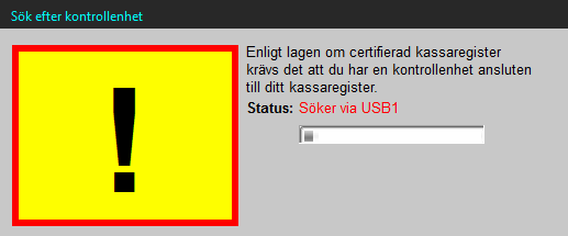 Vid uppstart av PC-Kassa påbörjas sökningen efter kontrollbox automatiskt. Om kontrollboxen kommer anslutas senare kan man avbryta sökningen genom att klicka flera gånger på texten "Söker via ...". Alternativt låt sökningen skanna av alla portar och hastigheter för att slutligen avbryta sig själv. Oavsett om kontrollbox är ansluten eller ej kan sökningen ta flera minuter.
