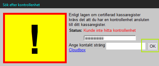 Om kassan inte ansluter till kontrollboxen Klicka OK följt av Stäng efter att sökningen är gjord.
