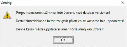 Tips! Uppdateringsfilen hanterar bland annat om PC-Kassa körs som fiskal (med kontrollbox) eller icke fiskal (utan kontrollbox). Databasens flaggning för fiskal eller icke fiskal ändras dock inte bara för att uppdateringsfilen är körd. Om en ändring av databasen mellan fiskal och icke fiskal ska göras behöver support kontaktas för att korrigera denna flaggning i databasen manuellt. Om databasen och programversionen inte överensstämmer mot fiskal/icke fiskal möts man av följande meddelande.