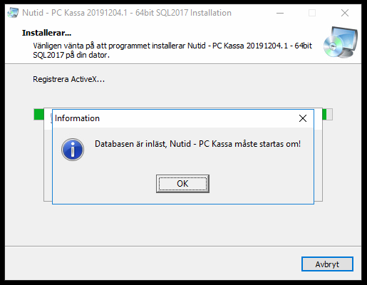 SQL-installationen samt inläsning av demodatabas är klar. Tryck OK för att fortsätta.