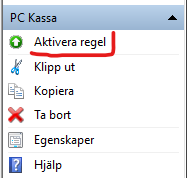 Om det ser ut som på bilden ovan så är två av fyra regler aktiverade. Nästa steg blir att aktivera de två som inte är igång. Detta gör man genom att markera regeln och i panelen Åtgärder till höger klicka på "Aktivera regel" under rubriken PC Kassa