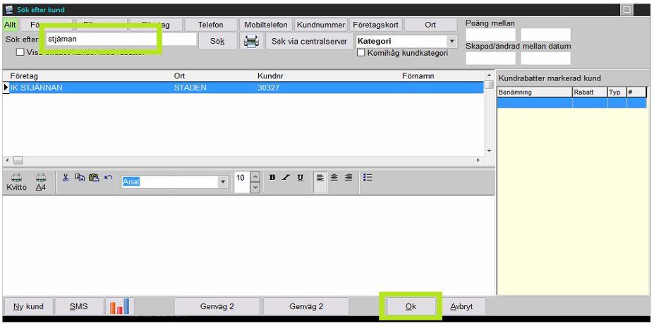 Sök fram förening eller kund, markera denna och välj knappen [OK].