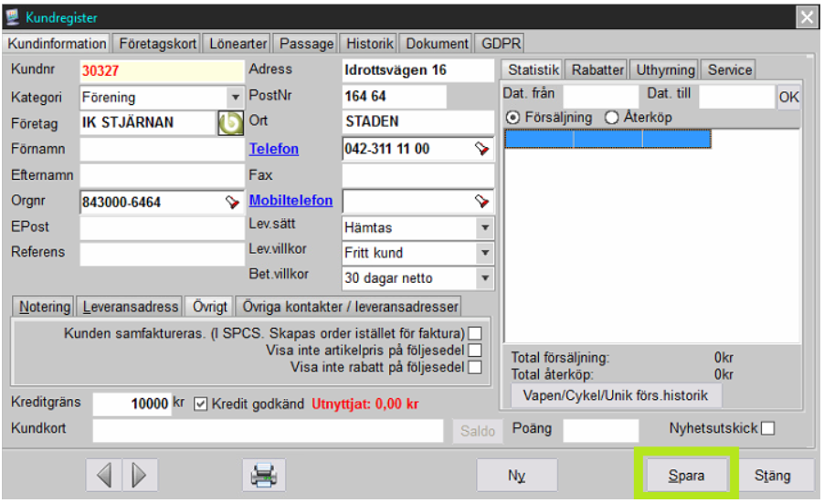 Fyll i relevant information om föreningen / kunden och tryck på knappen [Spara]. Använd med fördel kundkategorin för att ha möjlighet till eventuella urval och mer. Informationen kommer därefter att vara sökbar via kassafönstret när medlemmar handlar i butiken.