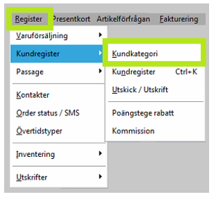 För att upprätta en ny kundkategori gå via menyn Register – Kundregister – Kundkategori.
