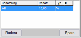 För att justera eller radera en rabatt markera denna i listan och välj att justera i fälten eller radera genom att trycka på knappen [Radera].