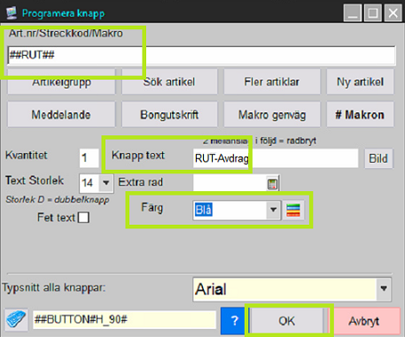 I det översta fältet anges makrot beroende på om knappen ska hantera RUT- eller ROT-avdrag. För RUT används makrot ##RUT## och för ROT används makrot ##ROT##. Ange en lämplig text på knappen och välj eventuell färg på knappen. Spara genom att trycka på OK-knappen längst ner.