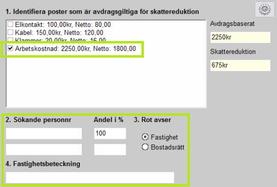 Användning av ROT-avdrag sker på samma sätt som med RUT-avdrag utöver att fönstret för inmatning av personnummer också innehåller kompletterande uppgifter för fastigheten.
