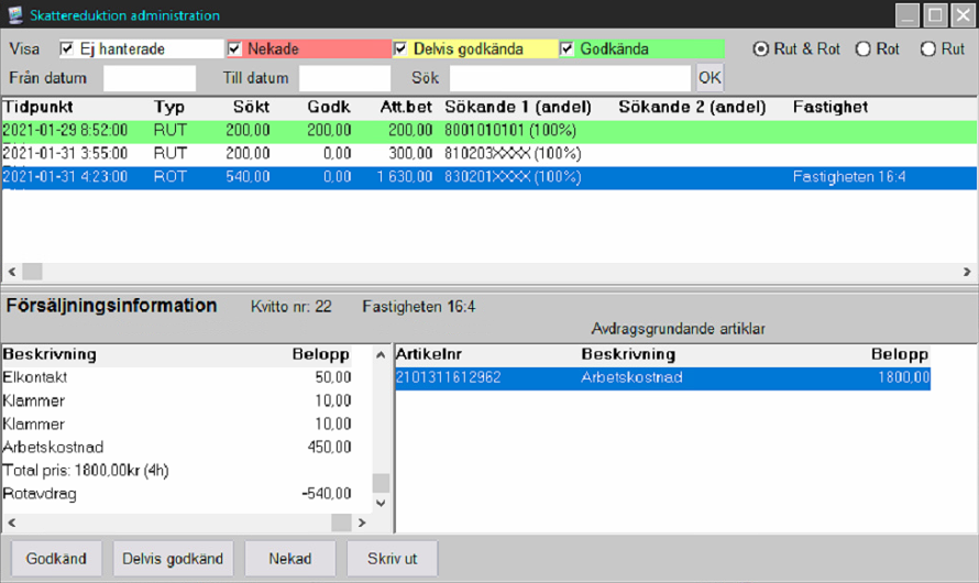 I detta fönster möts vi av samtliga utslag som gjorts med RUT- och ROT-avdrag. Det går bra att göra urval på olika premisser och utskrifterna som kan göras speglar urvalen. I nedre delen av fönstret ser vi en tydlig överblick över försäljningen samt de avdragsgrundande inslagen och här framgår även om det är kvittoförsäljning eller fakturaförsäljning. Det går också att markera ansökningar som godkända, nekade eller delvis godkända för en tydlig bild över vad som behöver hanteras.