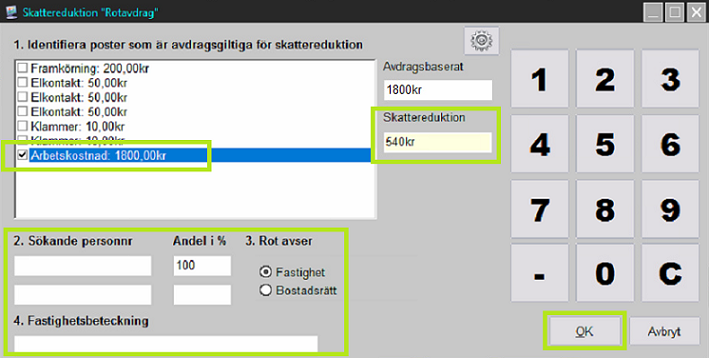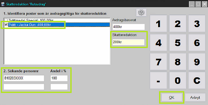 Kryssa i den eller de artiklar som är avdragsgiltiga för skattereduktion. PC-Kassa kommer därefter ihåg dessa till nästa gång. Ange personnummer på sökande och systemet räknar automatiskt ut skattereduktionen. Slutför med knappen [OK].