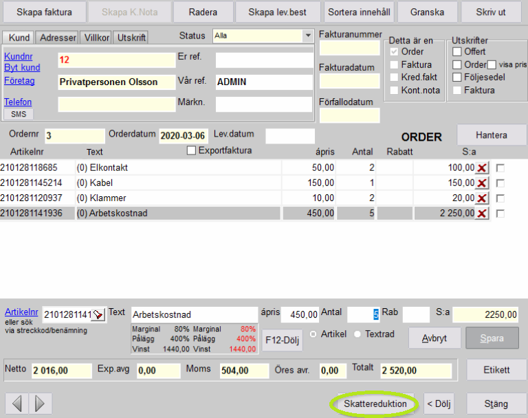 Avdraget för skattereduktionen infogas på ordern vartefter det går bra att skapa faktura / kontantnota som vanligt.