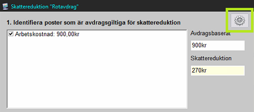 Ange relevanta inställningar och tryck en gång till på kugghjulet för att spara och återgå till avdragsfönstret.